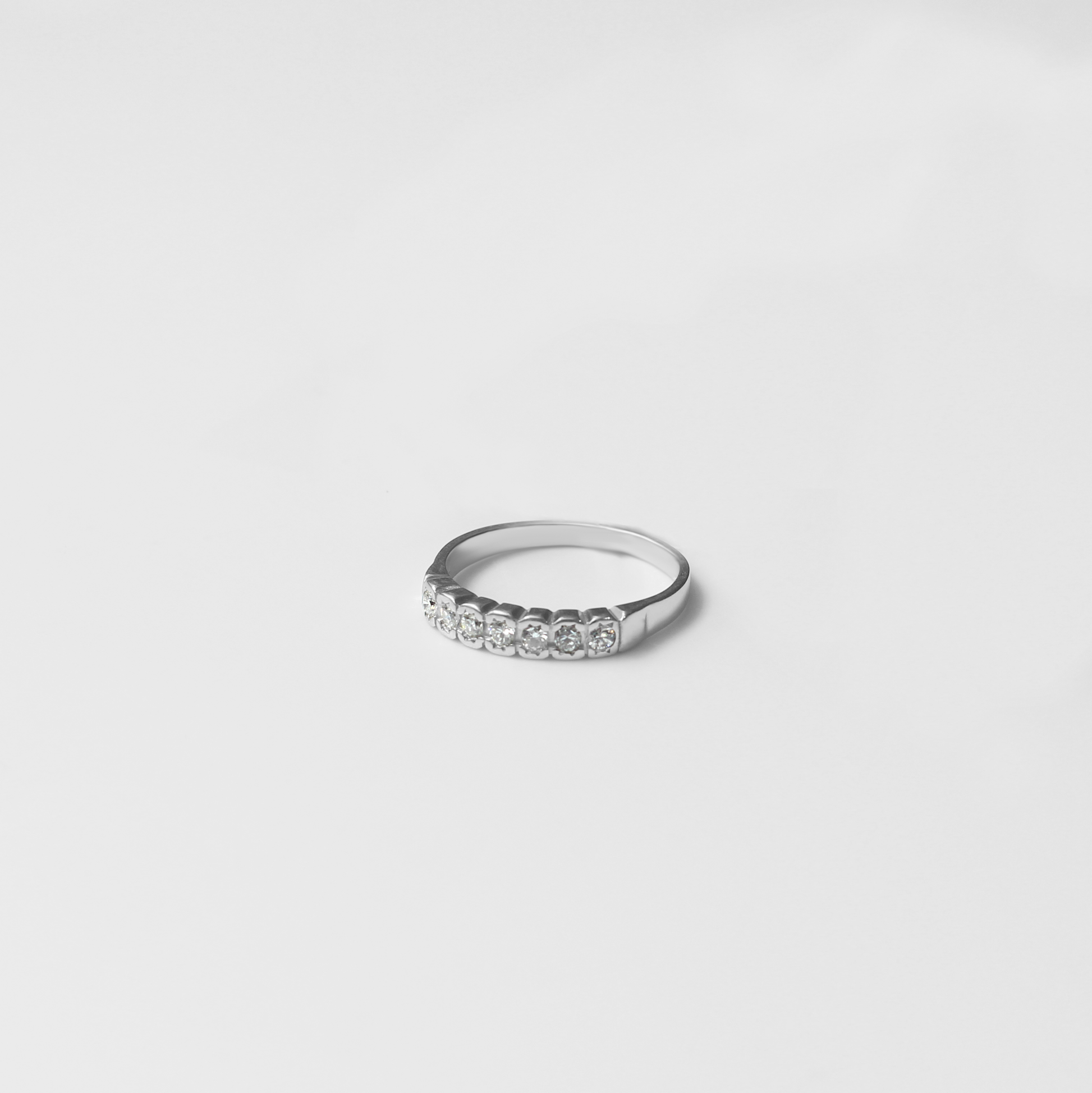 Radiant Row Ring — a luminous line of stones set in 18k white gold for sleek, continuous sparkle. Effortless and refined, it stacks beautifully or shines solo with modern brilliance.